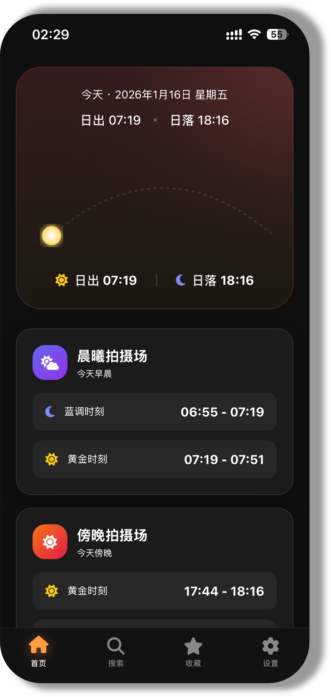 - 分场次展示:不同于传统的 24 小时列表,我将其智能划分为「晨曦拍摄场」和「傍晚拍摄场」。